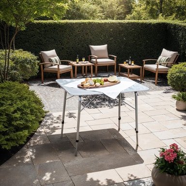 Et svært stabilt og kompakt campingbord. Kan brukes for seg, uansett om det er på balkongen, i hagen, til camping eller på neste grillaften. Den fanerte MDF-bordskiven er resistent mot fukt og annen miljøpåvirkning. Det høykvalitative campingbordet er omgjerdet av en aluminiumsramme. Teleskopbena kan stilles inn trinnløst i høyden og kan således stilles inn på den høyden dere ønsker. Sammenlagt kan det tas med overalt og stues unna for å spare plass.