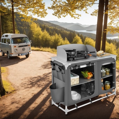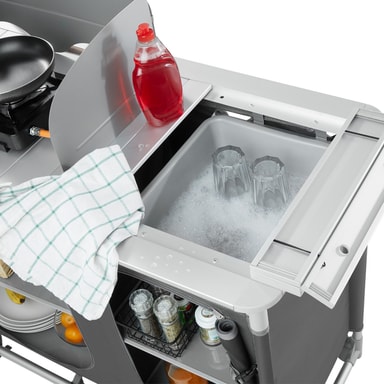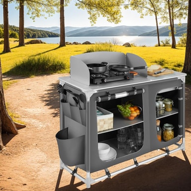 Campingkjøkkenet fra tectake overbeviser med gjennomtenkt design. Arbeidsplaten med praktisk vindbeskyttelse og vask som kan dekkes over er kjøkkenets viktigste del.Les mer om produktet