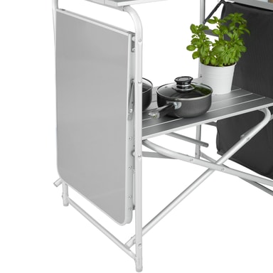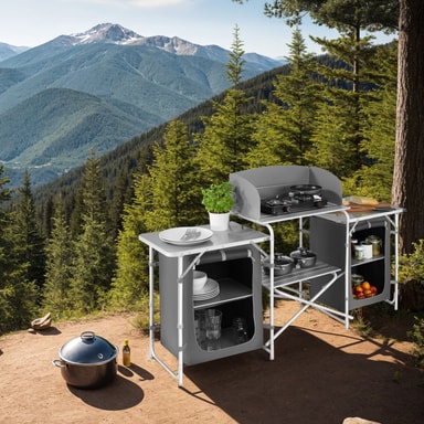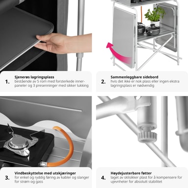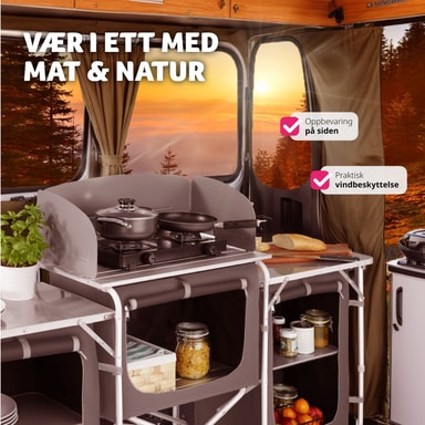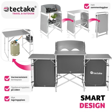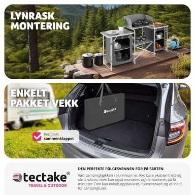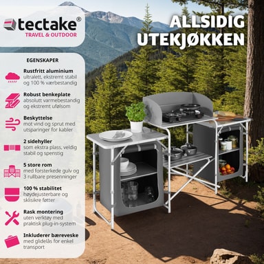 Med det robuste campingkjøkkenet fra tectake kan du kombinere den romantiske stemningen fra leirbålet med huslig komfort. Du setter opp det sammenleggbare utendørskjøkkenet på få minutter. Takket være de justerbare føttene på kjøkkenet gjør det ingenting om underlaget er ujevnt. Den varmebestandige arbeidsplaten med praktisk vindbeskyttelse egner seg for bruk med gasskomfyr. Du har god plass til kjøkkenutstyr på de to avlastningsplatene på sidene og i de tre låsbare oppbevaringsrommene. Nyt et lekkert måltid utenfor husets fire vegger med campingkjøkkenet fra tectake.