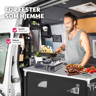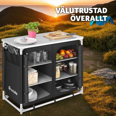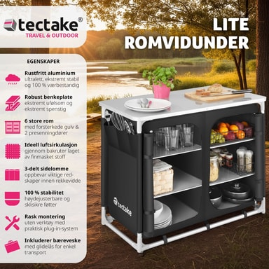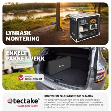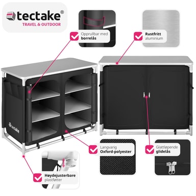 Det praktiske campingskapet fra tectake har stor oppbevaringsplass men tar liten plass. Det er enkelt og fort gjort å montere og demontere skapet. Kjøkkenboksen er utstyrt med en robust arbeidsflate og seks store oppbevaringsrom. Nettingen på baksiden sørger for god lufting. Føttene kan justeres separat slik at kjøkkenet står stabilt uansett underlag. Med dette romslige campingskapet fra tectake har du full kontroll på matlagingen også ute under åpen himmel.