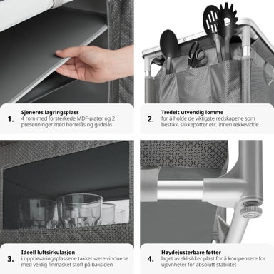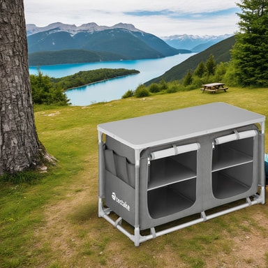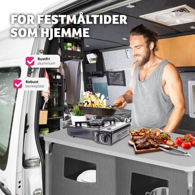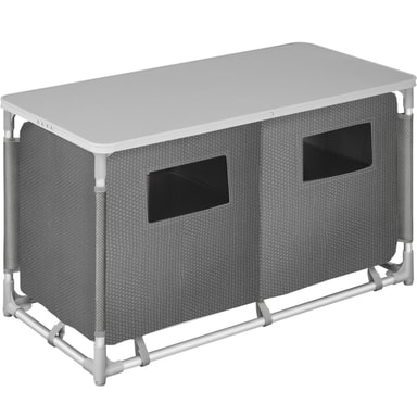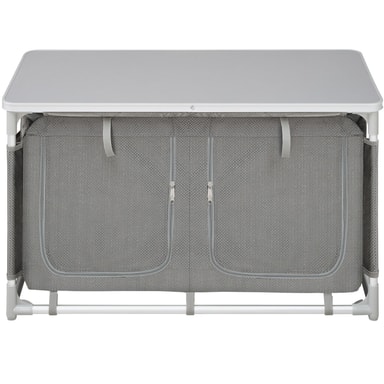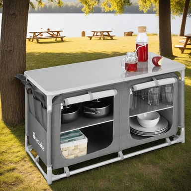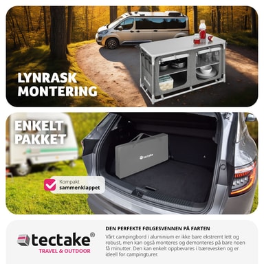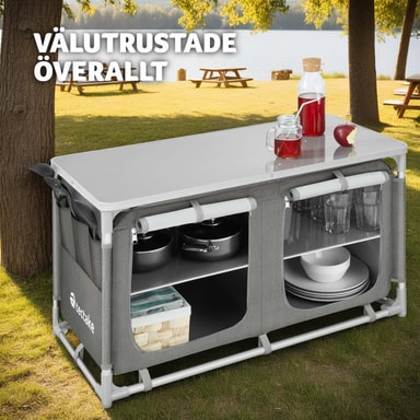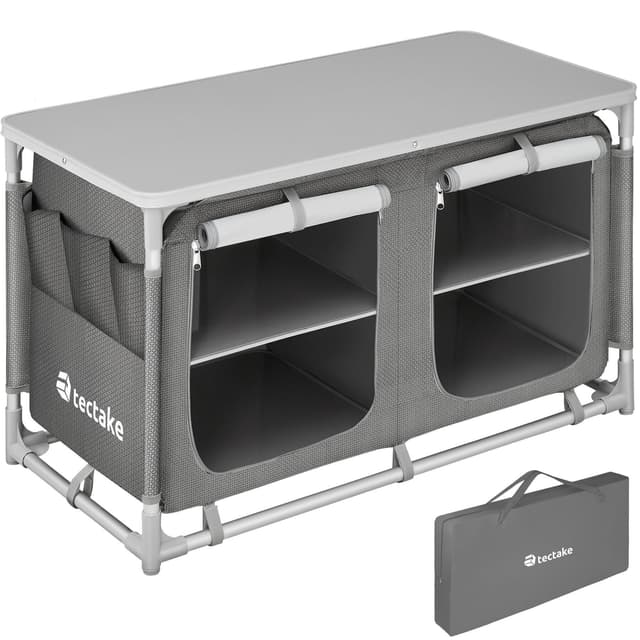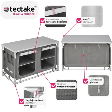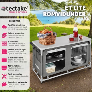 Det stabile campingkjøkkenet fra tectake er perfekt til din neste campingtur. Arbeidsflaten og de fire oppbevaringsrommene med innvendige plater i aluminium og netting, som sørger for god luftsirkulasjon, har god plass til kjøkkenutstyr. I den tredelte utvendige lommen på skapet kan du oppbevare mindre deler, som for eksempel bestikk. Siden de fire føttene på kjøkkenboksen kan justeres i høyden spiller det ingen rolle om underlaget er ujevnt. Lett å montere, kan pakkes kompakt: Det sammenleggbare campingkjøkkenet fra tectake passer perfekt til all slags bruk utendørs.