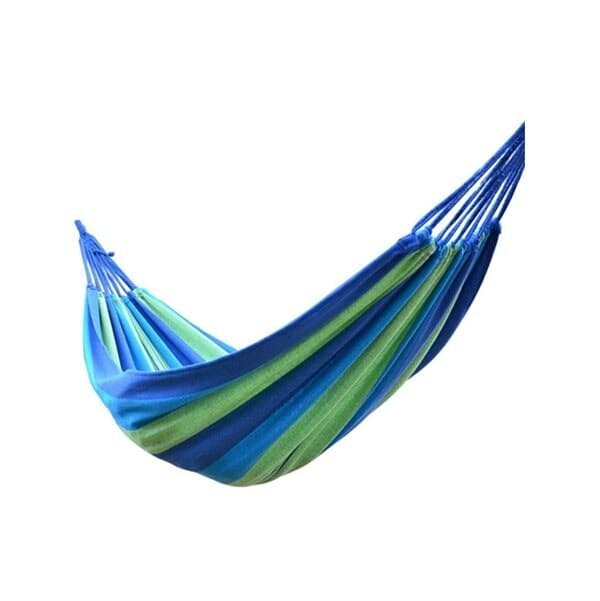 Denne blå- og grønnstripete hengekøyen er en perfekt kombinasjon av stil og funksjonalitet. Den er laget av mykt og koselig bomullsmateriale og er ideell for avslapping hjemme i hagen eller på campingturen. Med en imponerende maksimal belastning på 300 kg er den sterk nok til at hele familien kan ha glede av den. Etter en avslappende stund kan den enkelt rulles sammen for praktisk oppbevaring. De friske stripene gir en følelse av sommer og frihet, noe som gjør hengekøyen til et opplagt valg for dem som søker fred og ro i naturen.