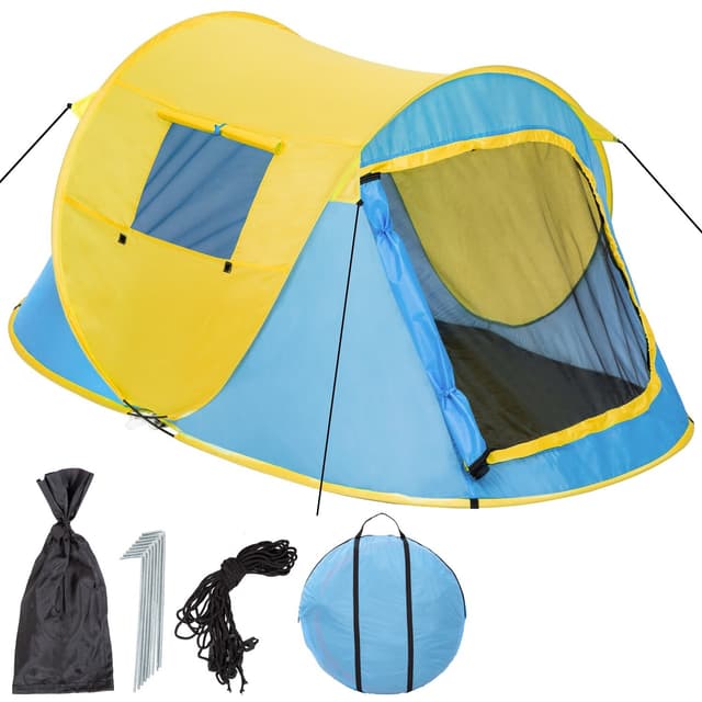 Dette stilige pop up-teltet er det optimale utstyret for neste campingtur. Det er godt med plass til 2 personer i dette praktiske teltet. Gjennom kastfunksjonen kan teltet reises på noen få sekunder. Et myggnett gir beskyttelse mot plagsomme insekter. Gjennom de innebygde fiberglasstengene har campingteltet hele tiden den nødvendige spenningen for å stå oppreist. Teltet har UV-beskyttelsesfaktor 30+.