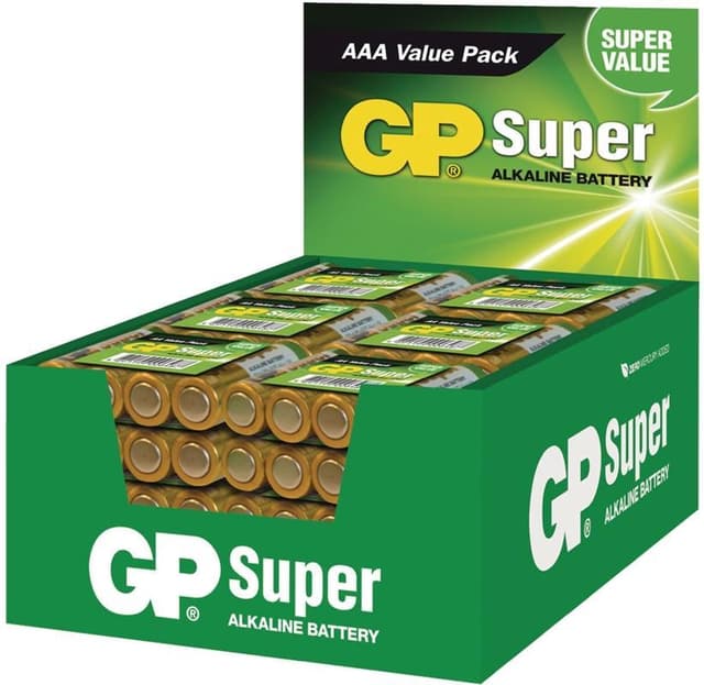 Alkaline AAA micro penlite storpack. Diskdisplayen inenhåller 24 förpackningar om 4 batterier.