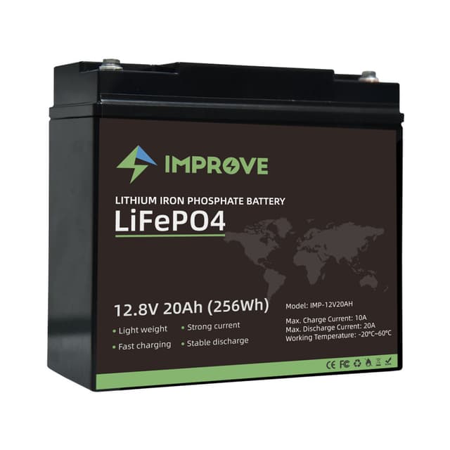 IMPROVE Lithium Batteri 12V 20Ah (LiFePO4) BMS 20A Batteriene fra Improve leverer god kvalitet til en fornuftig pris. Batteriene kan kobles i parallel for økt kapsitet og i serie opp til 48V Tekniske data: