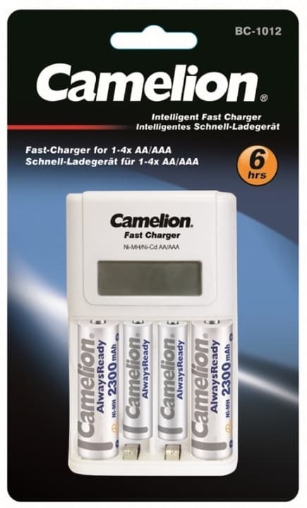 Camelion lader BC-1012 med 2 AA 2300 mAh og 2 AAA 800 mAh. Lader på ca. 12 timer. LCD-skjerm slik at du kan følge med på ladingen.