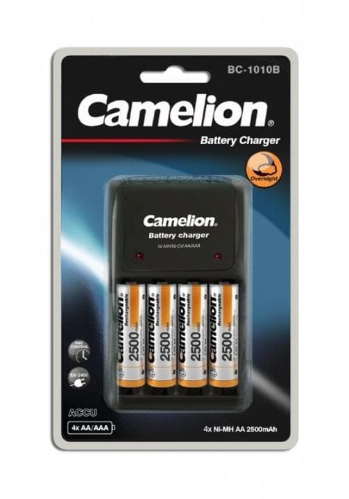 Camelion laddare BC1010B med 4 st AA 2500 mAh, 1-packSpecifikationer:Tillverkare: CamelionTyp: BatteriladdareLaddar typ av batterier: AA och AAA1-pack100-240 V4 st AA 2500 mAh batterier medföljerLes mer om produktet