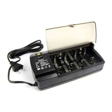 Denne universelle lader har 4 plasser for lading av AAA-, AA-, C-, D-batterier eller 2 plasser for 9V-batterier. Den innbygde batteritesteren viser batteristatus.
