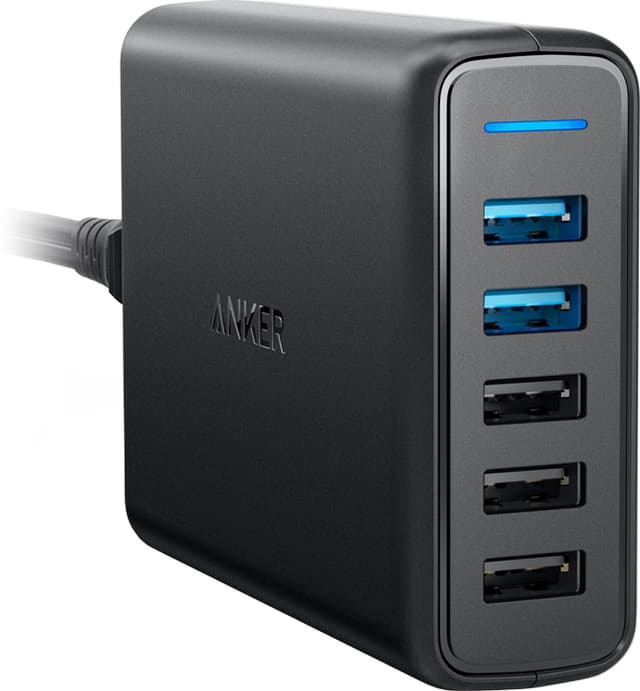 • Anker PowerPort 5 multiport USB-A lader (sort)