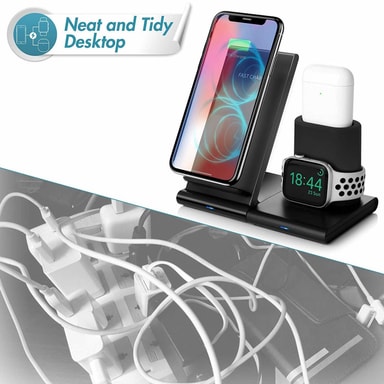 3-i-1 laddstation: Denna smarta laddstation laddar både din smartklocka, dina hörlurar och din mobil - på samma gång! Mobilladdaren har dessutom en praktisk trådlös funktion så du kan ladda din mobil helt utan sladdar. Observera att laddarna till hörlurar och smartklockan behöver anslutas via sladd för att fungera.