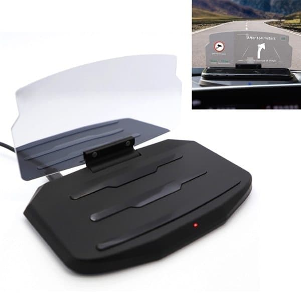 Dette er en HUD-mobilholder (Head Up Display) kombinert med en trådløs lader (Qi). Du kan bruke den som en GPS-navigeringsreflektor mens du trådløst lader mobilen. Mobilen ligger i holderen i frontruten og skjerminneholdet projiseres på HUD-skjermen.