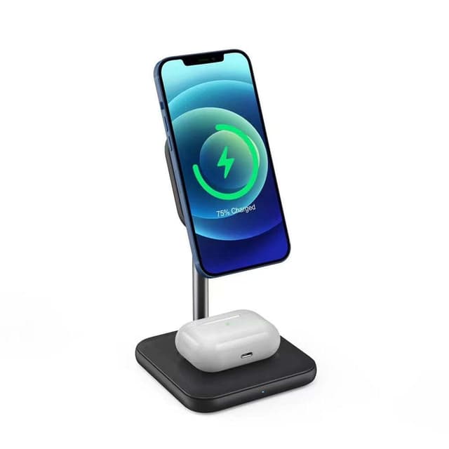 Denne Magsafe-ladestasjonen er en fleksibel løsning for å lade iPhone og Airpods samtidig. Den innebygde Magsafe-funksjonen gjør at mobilen din alltid havner rett på ladeflaten. Ladepunktet har en ergonomisk vinkel og kan lade telefonen din i alle retninger. Lad mobilen din i liggende modus mens du ser på videoer, eller stående modus for meldinger og ansiktsgjenkjenning. Laderen fungerer best med en 18W vegglader.
