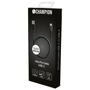 Champion Ultra Pro-kabelen er designet for å vare og være rask. Denne USB-C-kabelen vil lade enheten din i mange år framover, da den er forsterket med et dobbeltflettet ytre deksel og en indre aramidfiberkjerne og sterke metallegeringer. Denne kabelen er konstruert for ekstrem holdbarhet og daglig bruk. Tester viser at den tåler 20 000+ sykluser der kabelen er bøyd 180 grader.