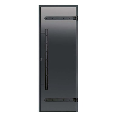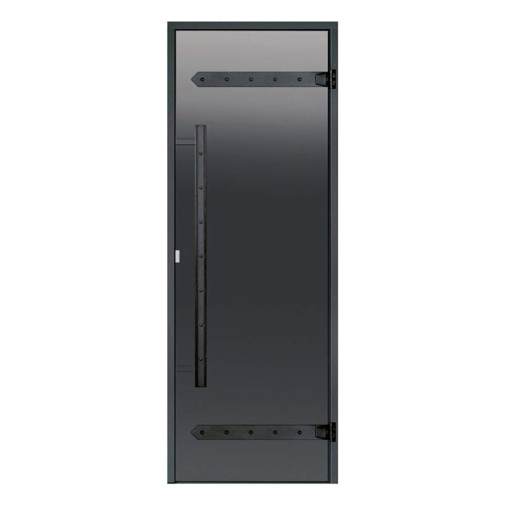Badstudør fra Harvia i røkgrått glass er produsert i spesialherdet glass for å tåle høy temperatur og vannsprut fra badstusteinene. Utformingen av Legend badstuedør er i stil med de rustikke Legend ovner og tilbehør. Karm og dørhåndtak er i sortmalt tre.