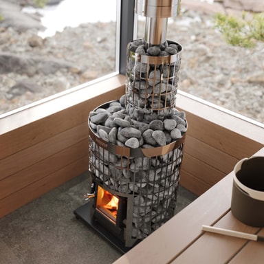 Cilindro vedfyrt ovn er produsert i robust rustfritt stål som sikrer stillegående bruk og lang holdbarhet. Cilindro har en flott glassdør med varmeglød som skaper en hyggelig stemning i saunaen og gjør det enkelt å holde fyr. Cilindro har også utskiftbare luftkontrollplater i ildrommet, dette forbedrer ovnens levetid og gjør vedlikehold enkelt. Med sin slitesterke konstruksjon i rustfritt stål og et elegant glasslokk, kombinerer Cilindro praktisk funksjonalitet med en innbydende atmosfære.