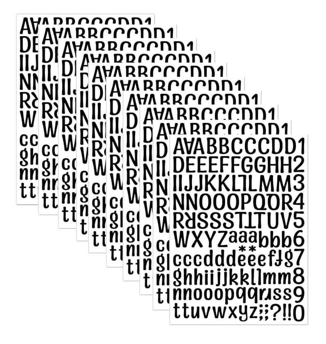 Høykvalitets klistremerker med bokstaver og tall. Vannbestandig og slitesterk, falmer ikke. Disse alfabetklistremerkene fester seg til alle glatte, rene overflater. Brukes til håndverk, bærbare, skap, sykler etc. Pakken inneholder totalt 1260 stk.
