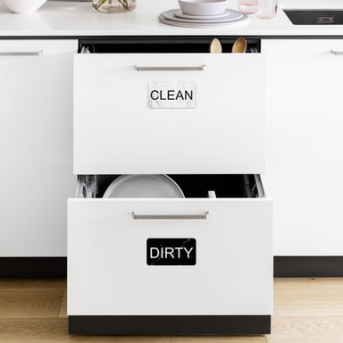 Vendbar og stilig design: Den ene siden av skiltet viser en ""Clean""-etikett og den andre siden viser en ""Dirty""-etikett. Med en enkel vending kan du markere om oppvasken i oppvaskmaskinen er ren eller skitten. Den moderne, rene designen gjør at oppvaskmaskinskiltet passer inn i ethvert kjøkken.