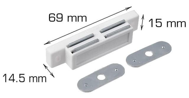 Mål: L69 x H15 x B14,5 mm Maks. belastning: 4 kg. per stk. 2 stk. per pose Materiale: Elforsinket/plastLes mer om produktet