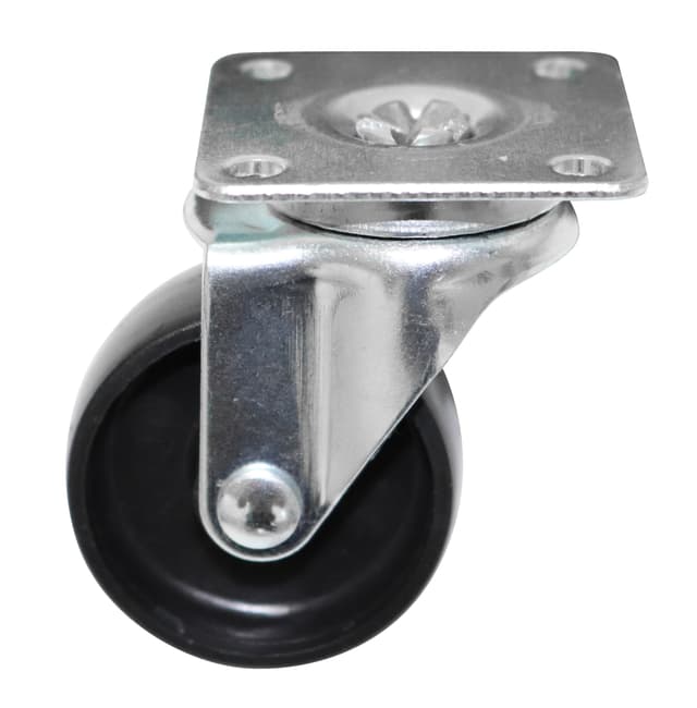 Plåtfäste i stål och svart plasthjul Svängbart 50 mm Hjuldiameter: 50 mm Hjulbredd: 18 mm Belastning: max. 40 kgLes mer om produktet