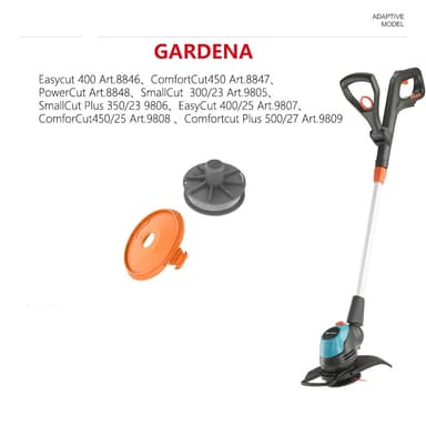 Kompatibilitet: Dette settet er utviklet for å være kompatibelt med en rekke Gardena trimmermodeller, inkludert 5307-20, 5344, Easycut 400 (Art.8846), ComfortCut 450 (Art.8847), PowerCut (Art.8848), SmallCut 300/23 (Art.9805), SmallCut Plus 350/23 (9806), EasyCut 400/25 (Art.9807), ComforCut 450/25 (Art.9808) og Comfortcut Plus 500/27 (Art.9809), noe som sikrer perfekt passform og optimal funksjonalitet.