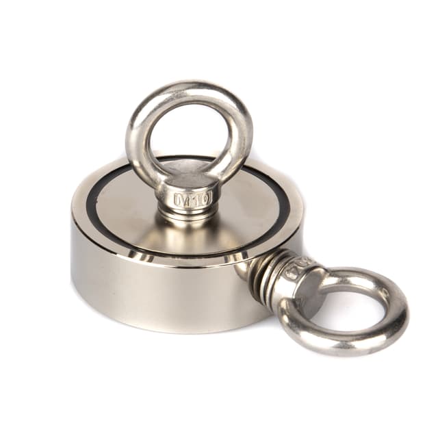 Supermagnet for magnetfisking med 250kg løftekraft på hver side. Magneten har 2 kroker som kan skrus av eller på etter ønske. Magneten er nikkelbelagt og kommer med festekrok i rustfritt stål. Vi anbefaler å bruke tau fra 10-30 meter med karabinkrok i enden, gjengelim til krokene og hansker. Se under anbefalt tilbehør.
