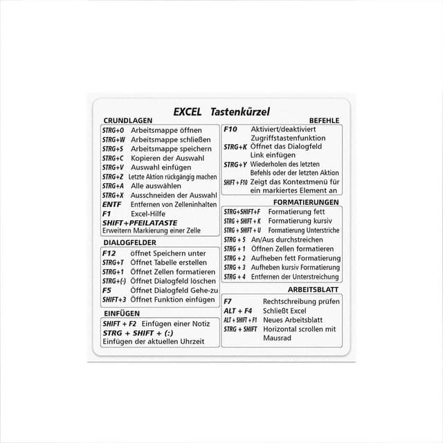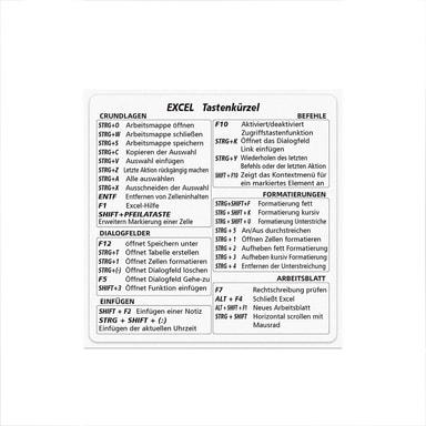 Øk Excel-effektiviteten: Disse tyske Excel-snarveisklistremerkene er designet for å forbedre effektiviteten din i Excel betydelig. Ved å gi en visuell guide til ofte brukte snarveier, minimerer disse klistremerkene behovet for å navigere gjennom menyer, noe som sparer verdifull tid og krefter. Ideell for fagfolk, studenter og alle som ønsker å mestre Excel, disse klistremerkene effektiviserer arbeidsflyten din og lar deg fokusere på oppgaven. Kompatibel med MAC OS, WINDOWS og EXCEL, disse klistremerkene er et allsidig verktøy for alle som ønsker å forbedre sine Excel-ferdigheter. Den klare layouten og de lettfattelige tyske etikettene gjør det intuitivt og tilgjengelig å lære snarveier, uavhengig av din tidligere erfaring. Transformer din Excel-opplevelse og frigjør ditt fulle potensial med disse snarveisklistremerkene.
