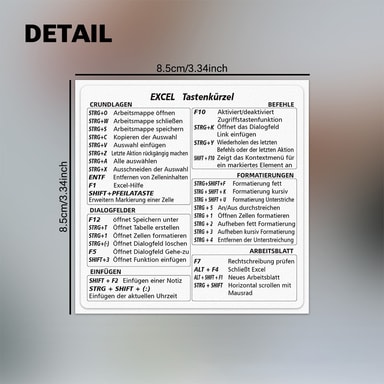 Enkel læringskurve: Det har aldri vært enklere å lære tyske Excel-snarveier med disse brukervennlige klistremerkene. Klistremerkene gir en klar og konsis visuell referanse, slik at du raskt kan huske og bruke viktige snarveier. Denne akselererte læringsprosessen er perfekt for både nybegynnere og erfarne brukere som ønsker å utvide sin kunnskap om Excel. Kompatibel med MAC OS, WINDOWS og EXCEL, disse klistremerkene tilbyr en sømløs integrasjon i din eksisterende arbeidsflyt. Den intuitive designen og omfattende dekningen av viktige snarveier gjør disse klistremerkene til et uvurderlig verktøy for alle som ønsker å forbedre sine Excel-ferdigheter. Enten du er student, profesjonell eller bare ønsker å forbedre ferdighetene dine, gir disse klistremerkene en enkel og effektiv måte å mestre tyske Excel-snarveier på.