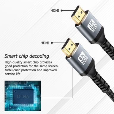 8K ved 60Hz oppdateringsfrekvens: Denne HDMI-kabelen støtter en imponerende 8K@60Hz oppdateringsfrekvens, som sikrer ekstremt jevne bevegelser og minimerer etterslep i spill, actionfylte filmer og dynamisk innhold.
