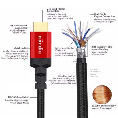 NÖRDIC CERTIFIED CABLE Certified 3M Ultra High Speed HDMI 2.1 8K 60Hz 4K 120Hz 48Gbps Dynamic HDR Earc VRR Nylon Flettet Kabel ForgyltLes mer om produktet