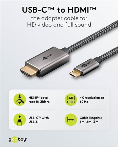 USB-C™ til HDMI™-kabelen støtter sylskarpe oppløsninger på opptil 4K ved 60 Hz på en skjerm, TV eller projektor
