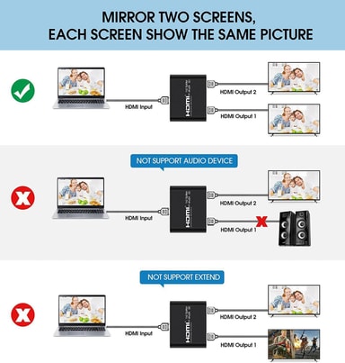 Kompatibilitet: HDMI-splitteren tar innhold fra en enkelt HDMI-enhet, f.eks. en Playstation, Xbox eller Blu-ray-spiller, og sender det til to HDMI-kompatible skjermer.