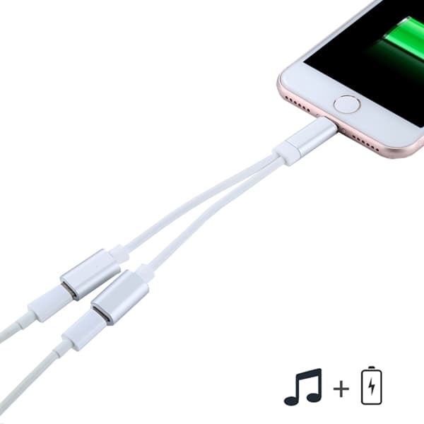 Men en kombinert adapter kan du lade din telefon og høre på musikk samtidig. Dette fordi kabelen har en 8- pinners han i ene enden og to tilsvarende hunner i den andre.