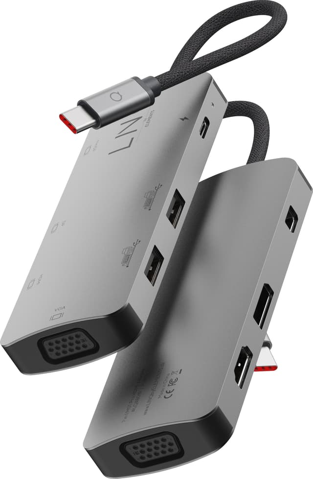 Oppgrader tilkoblingsmulighetene du har tilgjengelig med LinQ 7in1 USB-C hub som lar deg samtidig koble til opptil tre skjermer med 4K-oppløsning for en klar og solid bildekvalitet. Den praktiske USB-C-donglen gir en USB-C-port med opptil 100 W gjennomgangsstrøm for lading, to USB-A-porter for ekstrautstyr som datamus og USB-pinne, DisplayPort, Mini DisplayPort, HDMI-port og en VGA-port som lar deg koble til eldre skjermer og TV-er.