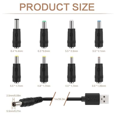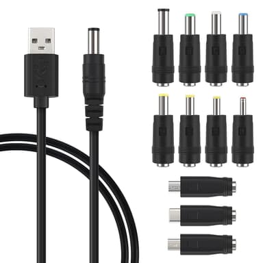 USB Strømkabel som kan brukes til ulike mobile og elektroniske enheter. Kabel med USB A på den ene siden og 5,5x2,5mm på den andre siden