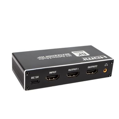 NÖRDIC HDMI 2.1 Splitter 8K60Hz 1 til 2 med innebygd extractor (SPDIF/Coaxial/3,5mm) er en kraftig løsning for å dele én HDMI-kilde til to skjermer samtidig, samtidig som lyden ekstraheres til eksterne lydsystemer. Med støtte for opptil 8K-oppløsning og HDMI 2.1 er den perfekt for både avanserte hjemmekinooppsett og profesjonelle installasjoner.