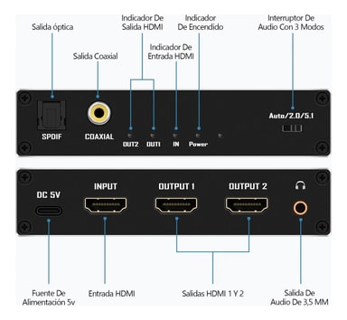 1 × HDMI 2.1 Splitter 1×2 med innebygd extractor