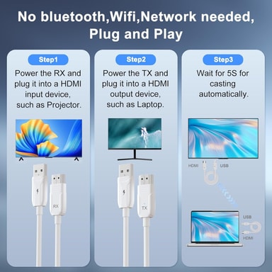 Denne trådløse HDMI-forlengeren med sender og mottaker gjør det enkelt å speile eller utvide skjermen din – helt uten apper, Bluetooth eller Wi-Fi. Koble til via plug-and-play, trykk på knappen i 5 sekunder og vent noen sekunder på tilkobling. Perfekt for jobb, hjemmekino, spill eller reise.