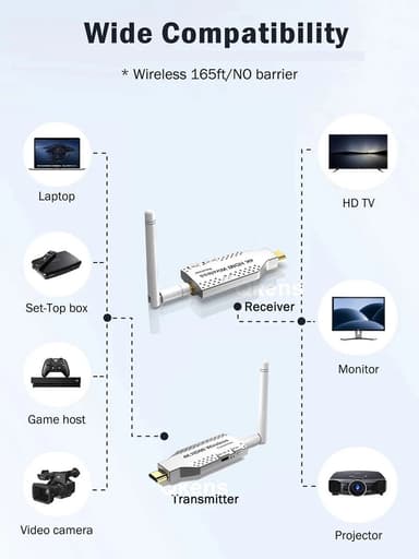 Dette produktet er en trådløs HDMI-forlenger som lar deg overføre video og lyd i opptil 4K-oppløsning fra en datamaskin, kamera, spillkonsoll eller annen HDMI-enhet til TV, skjerm eller projektor – helt uten kabler. Med en rekkevidde på opptil 50 meter, støtte for 5G-hastighet og ekstern antenne for stabil signaloverføring er dette en kraftfull og praktisk løsning for hjemmeunderholdning, konferanser, klasserom og utendørs bruk.