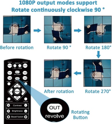 FunksjonerDeler opp et høyoppløselig videosignal i 9 blokker og distribuerer til 9 skjermer