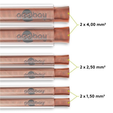 • Høyttalerkabel med høykvalitets flertrådet kobbertråd (OFC: oksygenfritt kobber) for svært gode overføringsegenskaper, f.eks. mellom HiFi-systemer og høyttalere