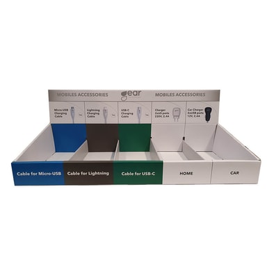 Gear ladesett borddisplay - kun løs display!. Praktisk og selgende bordvisning. Grunnleggende ladningsområde på en liten overflate. Samme som 665997 - dog uten innhold!