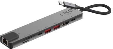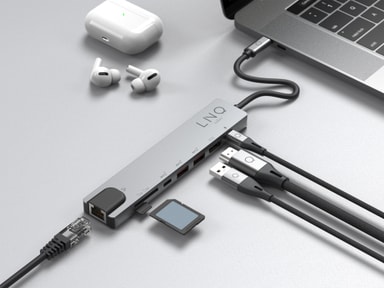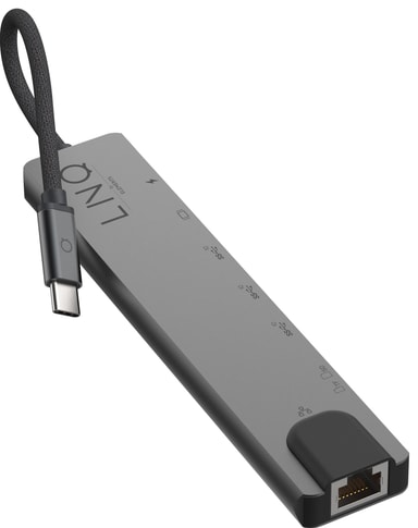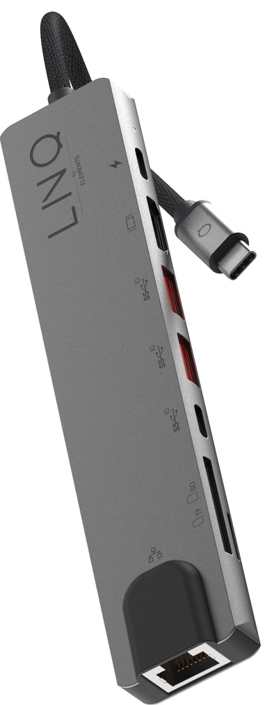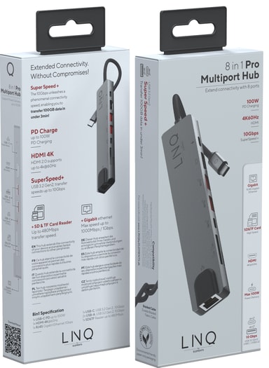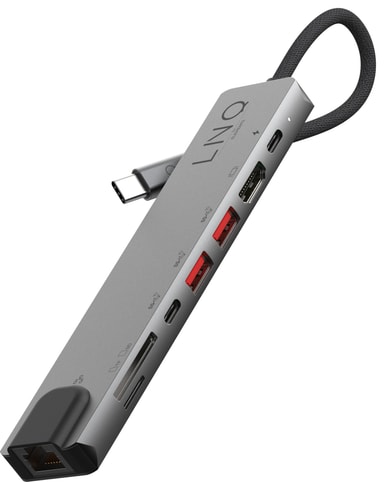 Med LinQ 8in1 Pro USB-C hub kan du enkelt forbedre tilkoblingsmulighetene til din bærbare PC. USB-C-huben gir en rekke tilkoblingsmuligheter og støtter en forbindelse på opptil 4K ved 60 Hz til en ekstern skjerm via HDMI-porten. Du kan koble alt av ekstrautstyr til gjennom to USB-A-porter og to USB-C-porter med støtte for Power Delivery. Videre vil Ethernet-porten gi rask og pålitelig kablet internett, mens SD- og Micro SD-minnekortspor gir rask filoverføring.