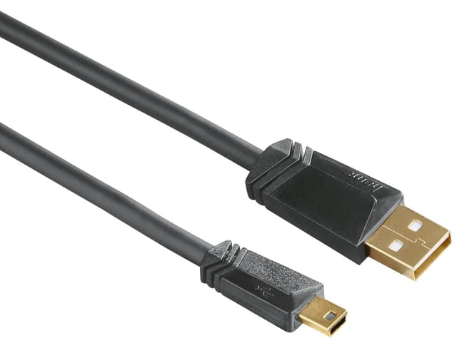 Hama USB 2.0-kabel med type A til type B mini-kontakter for overføring av signaler, eksempelvis mellom digitalkamera og TV. Kommer med overføringshastighet på opptil 480 Mbit/s og er baklengs kompatibel med USB 1.1