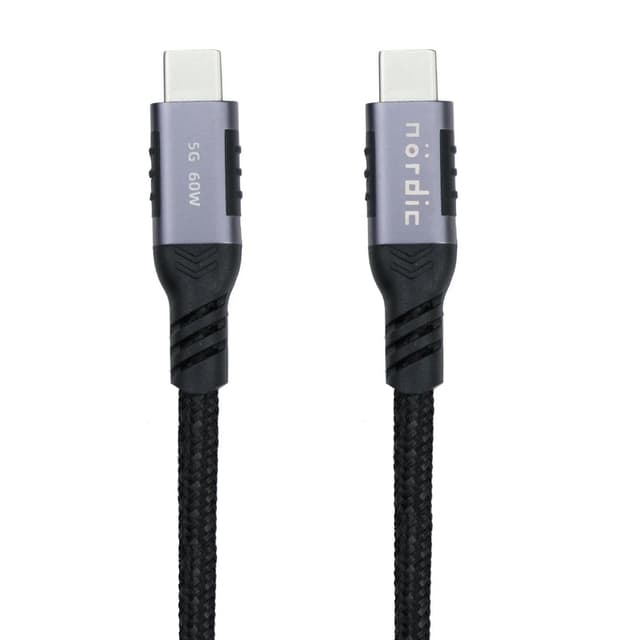 NÖRDIC høyytelses USB3.1 Gen1 USB C til USB C-kabel med 5 Gbps dataoverføringshastighet, 60 W strømforsyning for rask lading av bærbare datamaskiner, nettbrett og mobiltelefoner.