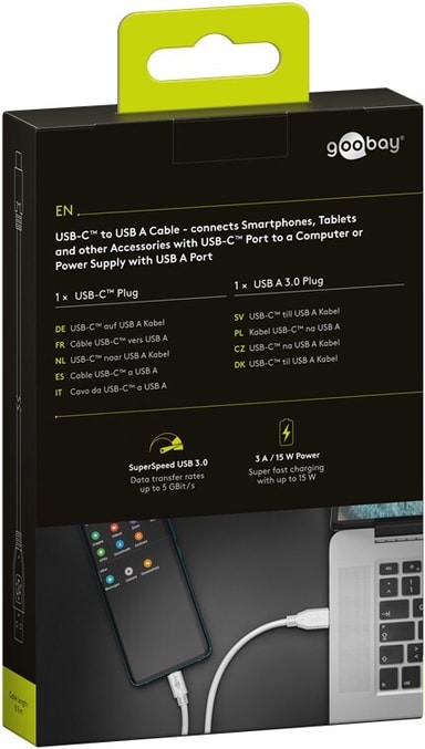 Hurtigladefunksjon - USB-C™-ladekabel for superrask synkronisering og lading av USB-C™-kompatible enheter med en utgangseffekt på opptil 15 W.