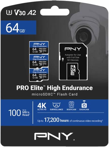 PNY PRO Elite High Endurance microSD-kort 64 GB tilbyr raske lese/skrivehastigheter på opptil 100/90 MB/s. Det er perfekt for 4K video, bilder, og apper, med Class 10, U3, V30, og A2-sertifiseringer. Et SD-adapter er inkludert for enkel bruk.Les mer om produktet