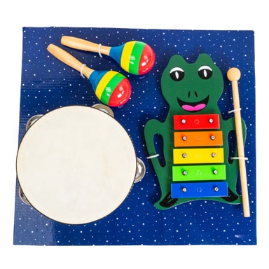Fargerik perkusjonspakke for barn Klokkespill med trefot og metall lydstav, inkl. hammer Tamburin av tre med skinn og tre par bjeller Et par...Les mer om produktet