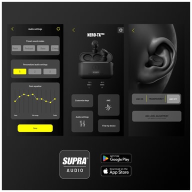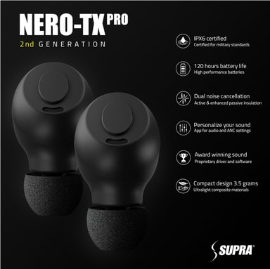 Med ekstra kompakte Supra NERO-TX Pro helt trådløse in-ear hodetelefoner får du detaljert lyd, aktiv støykansellering og et svette- og støtsikkert design. Videre får du en spilletid på opptil 7 timer per lading med 16 ekstra ladinger via ladeetuiet.Les mer om produktet