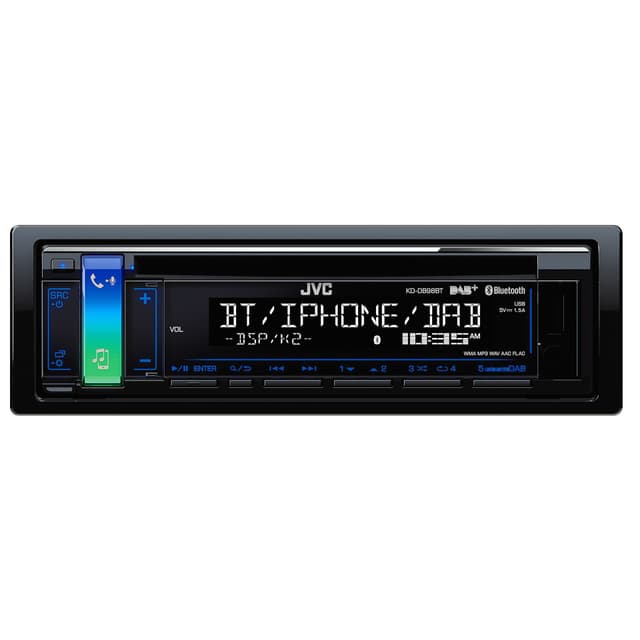 JVC bilstereo KD-DB98BT er utstyrt med digital radio med Bluetooth og AUX- og USB-inngang foran. Koble til mobilen din trådløst og spill av musikk og ta handsfreesamtaler.