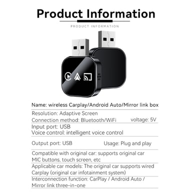 Brukervennlig design: Q1AS-adapteren har en brukervennlig design som gjør den utrolig enkel å sette opp og bruke. Bare plugg adapteren inn i bilens USB-port, koble smarttelefonen din via Bluetooth eller WiFi, og du er klar til å gå. Adapteren er kompatibel med originale bilkontroller, inkludert mikrofonen og berøringsskjermen, noe som sikrer en sømløs integrasjon med bilens eksisterende system. Den kompakte og lette designen gjør den enkel å transportere og lagre. Q1AS-adapteren er den perfekte løsningen for alle som ønsker å oppgradere bilens infotainmentsystem uten bryet med kompliserte installasjoner. Nyt bekvemmeligheten av trådløs tilkobling og en strømlinjeformet brukeropplevelse.